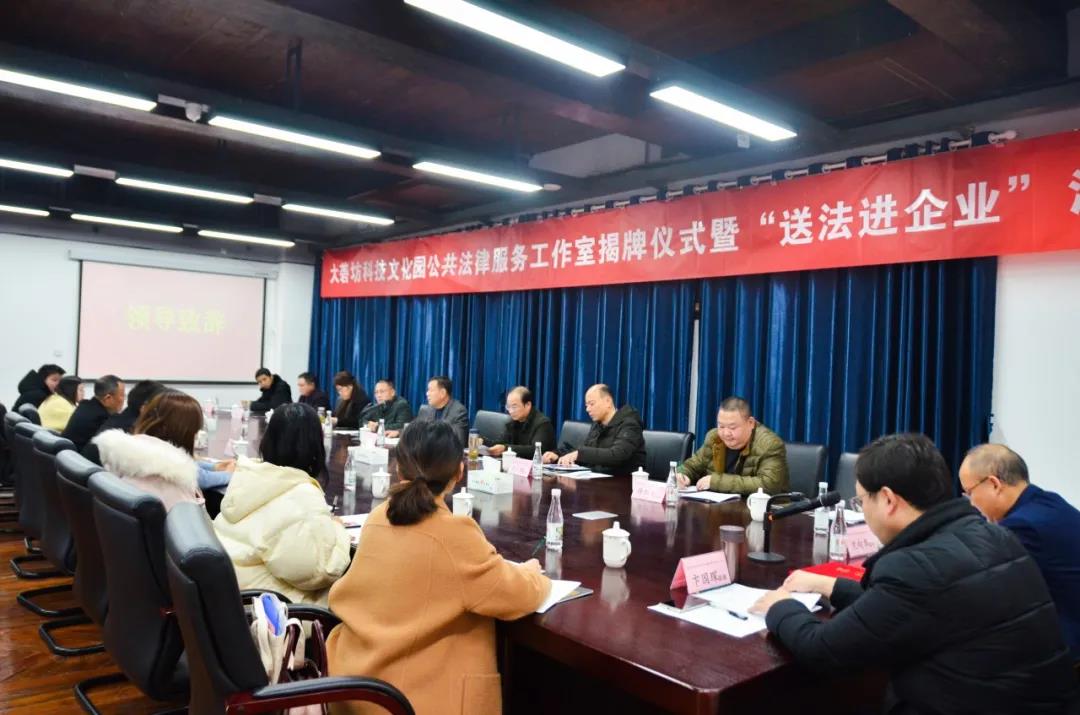 12月11日,大礱坊科技文化園公共法律服務工作室揭牌儀式暨“送法進企業”活動在園開展,區司法局、區委政法委、區法院、區檢察院、區工商聯、區經信局、區委常委、政法委書記魏峰及各成員單位、園區負責人、企業代表等50余人出席活動。